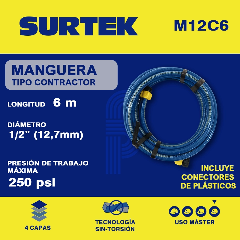 La Manguera para Jardín tipo Contractor Surtek M12C6 1/2 pulgada es una opción confiable para Jardinería doméstica, riego de áreas pequeñas o medianas.