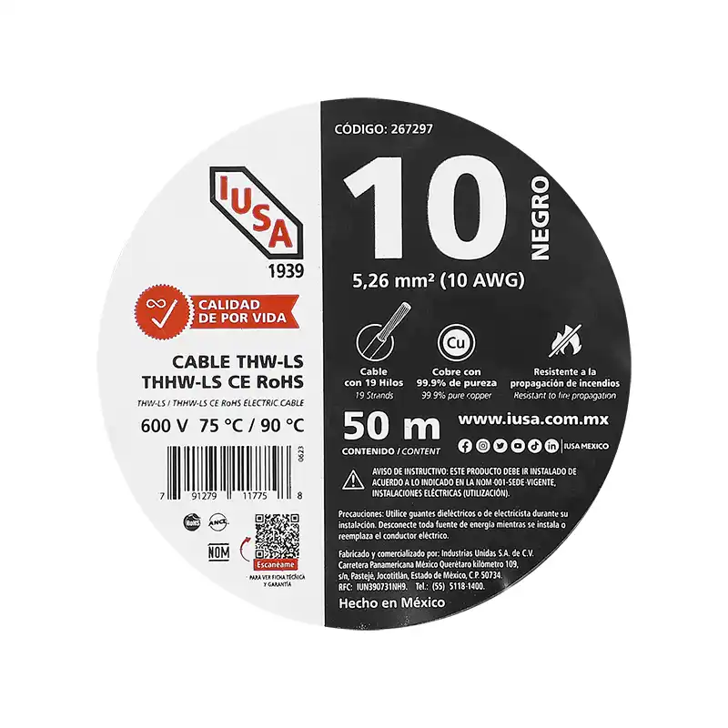 1 Rollo de Cable THHW-LS ROHS Iusa 267297 Negro Cal.10 AWG Rollo 50m.
