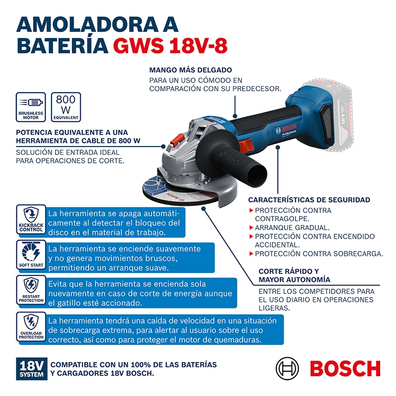 1 Esmeriladora Angular Brushless 18V Bosch GWS 18V-8.