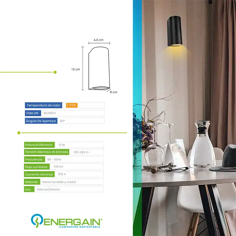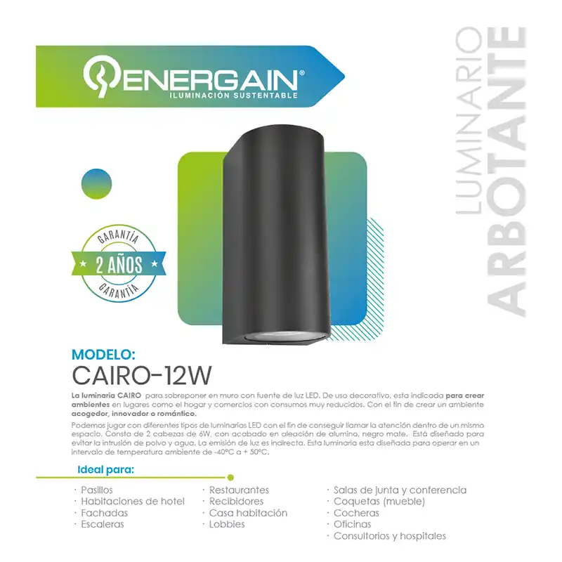 El arbotante LED de sobreponer Energain EG-CAIRO-12W en blanco cálido es una luminaria robusta y decorativa, ideal para exteriores que requieren estilo y resistencia.