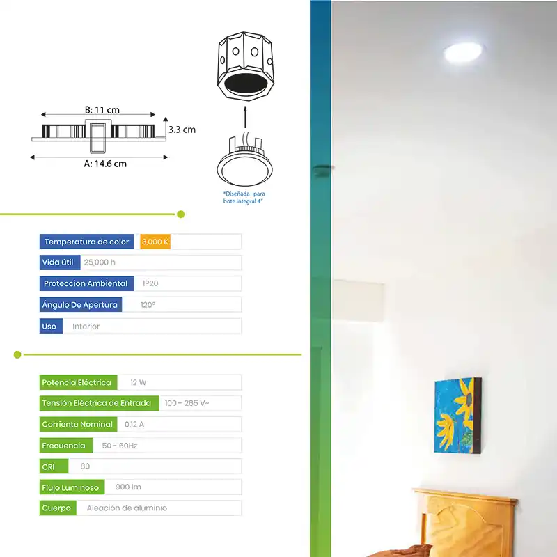 Lámpara LED empotrable tipo downlight, ideal para interiores que requieren eficiencia y estética discreta.