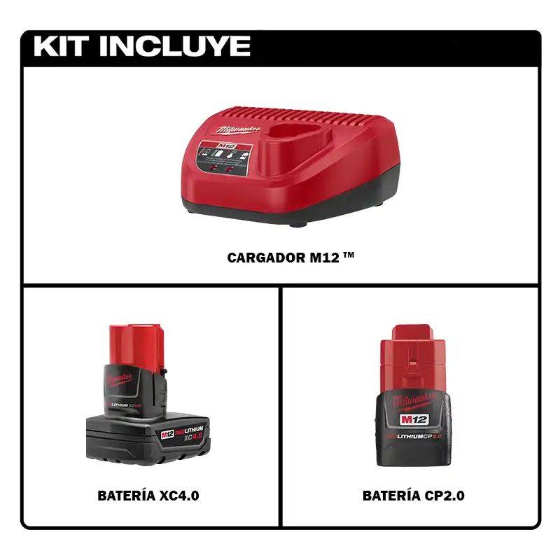 El kit Milwaukee 48-59-2424 incluye baterías de iones de litio REDLITHIUM M12 con un cargador, ofreciendo un rendimiento mejorado en comparación con los paquetes de baterías de iones de litio estándar. Este kit típicamente viene con dos baterías: una compacta (CP) de 2.0Ah y una de capacidad extendida (XC) de 4.0Ah.