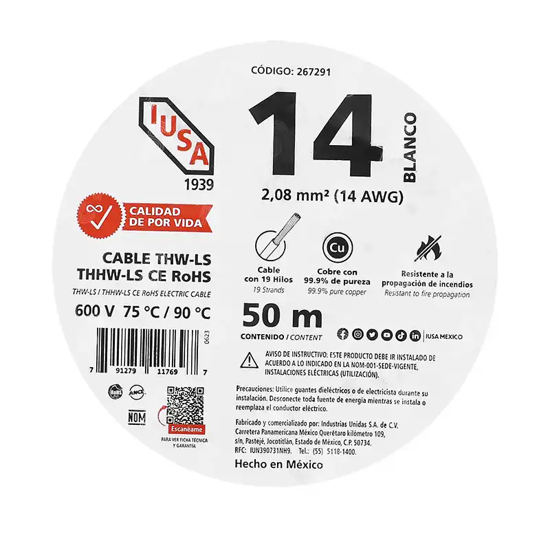 1 Rollo de Cable THHW-LS ROHS Iusa 267291 Blanco Cal.14 AWG 50m.