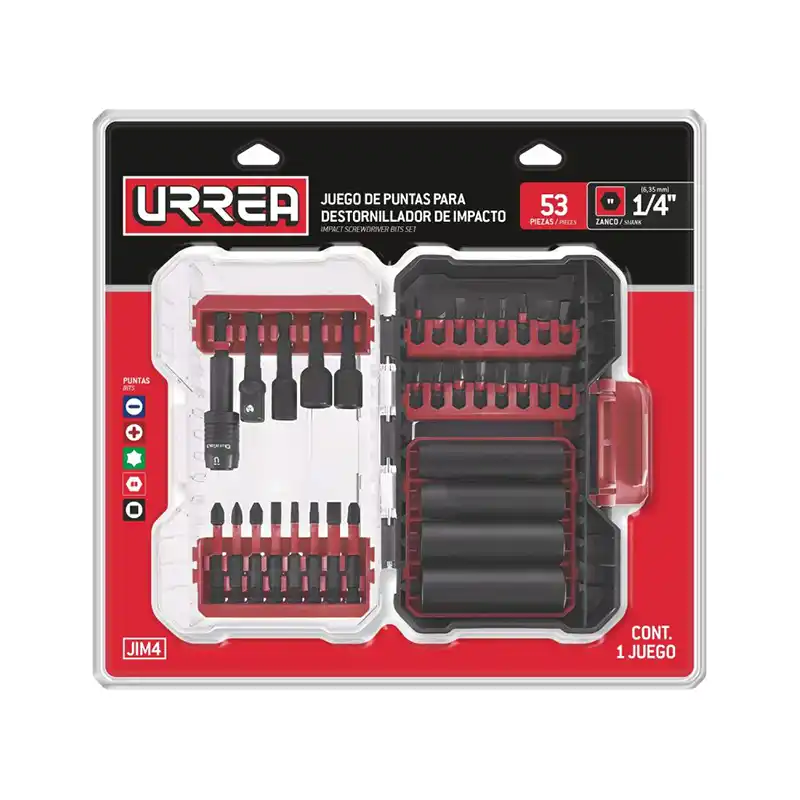 El Juego de Puntas de Impacto Urrea JIM4 de 53 piezas es una excelente opción para trabajos exigentes de atornillado.