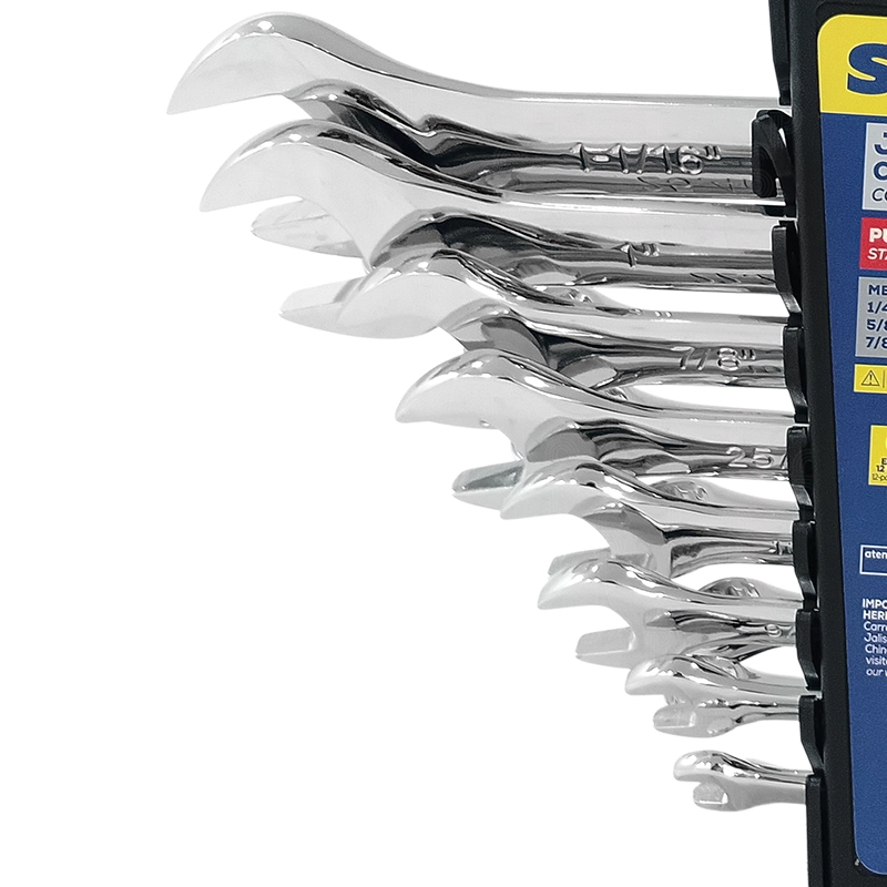 El Juego de Llaves Combinadas Pulido Espejo en Pulgadas Surtek 1051R es un set de 16 piezas con 12 puntas y acabado pulido espejo, diseñado para un manejo cómodo y fácil limpieza.