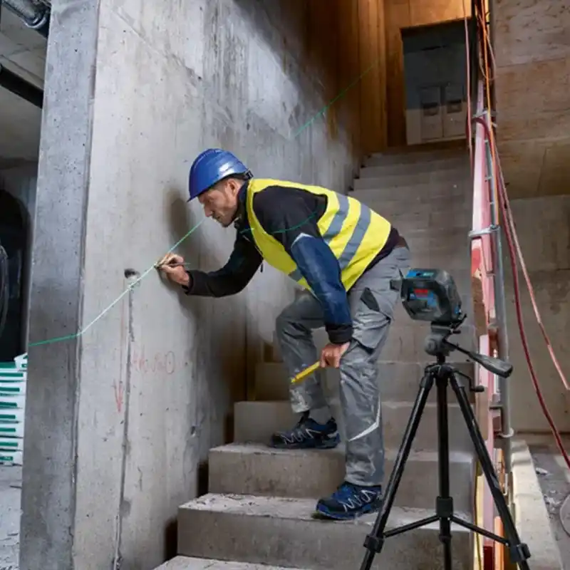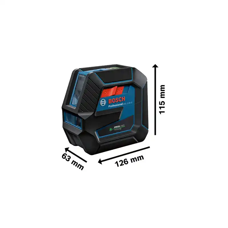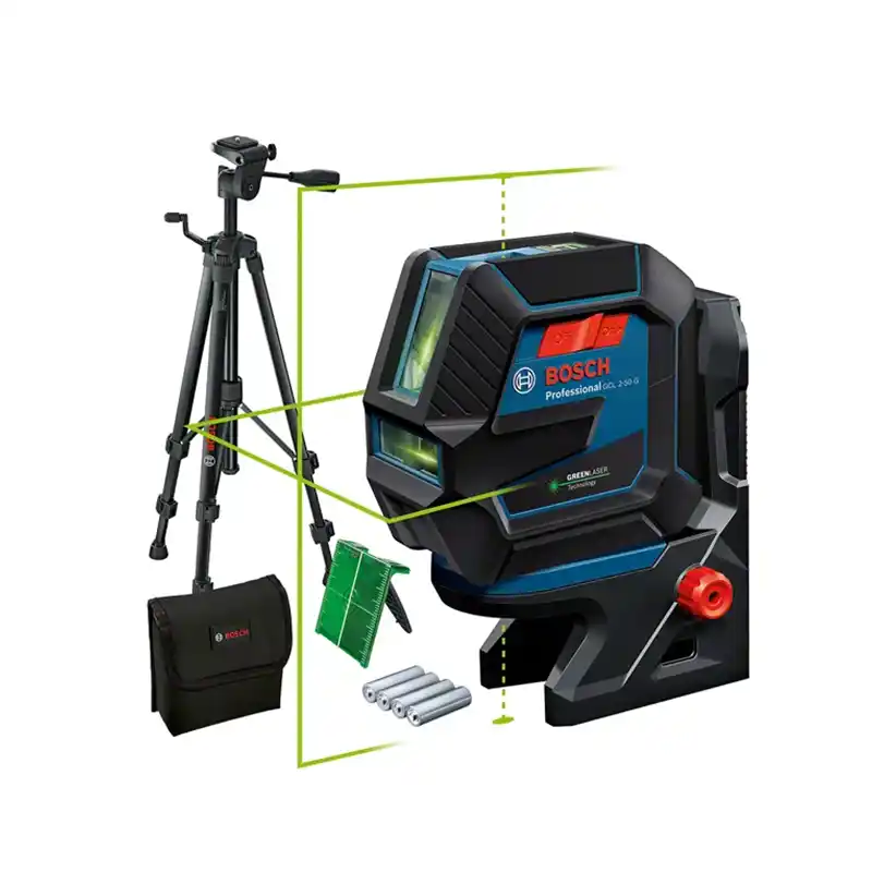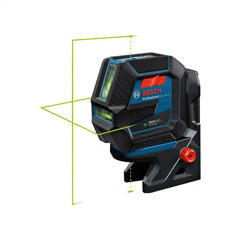 El nivel láser combinado Bosch GCL 2-50 G Professional proyecta líneas láser horizontales y verticales, además de puntos de plomada, todos en color verde para una visibilidad superior.