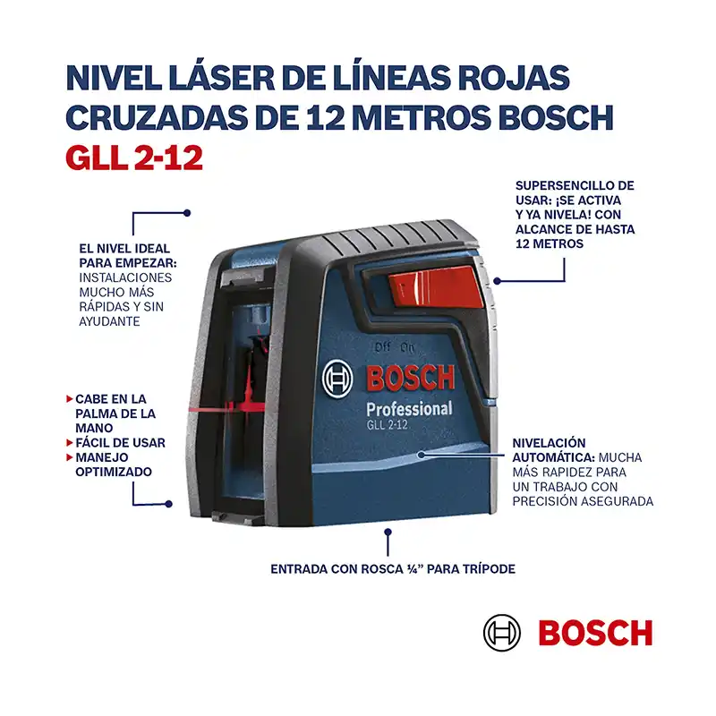 El nivel láser de líneas transversales rojas Bosch GLL 2-12 es una herramienta compacta y fácil de usar, ideal para proyectos de alineación y nivelación en interiores.