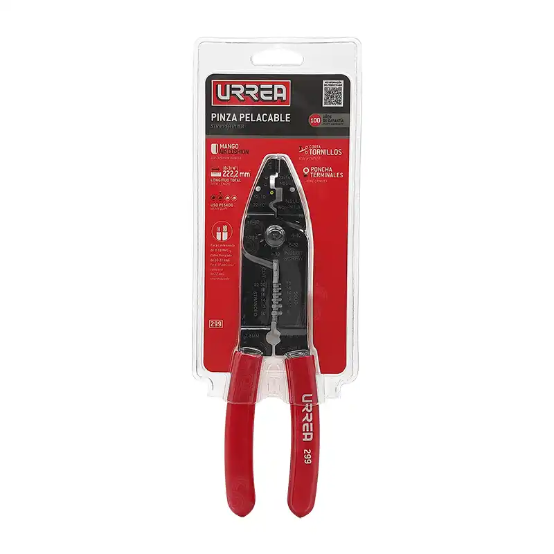 La pinza pelacable Urrea 299, de 8-3/4 pulgadas, es una herramienta multiusos con funciones de corte, pelado y ponchado, además de una característica adicional para cortar tornillos.