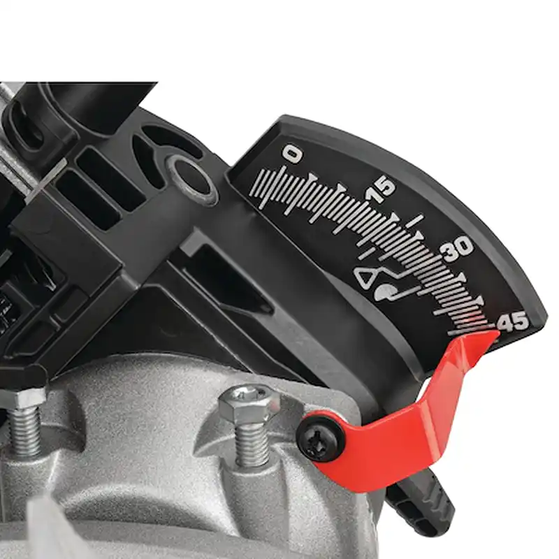 Los cortes transversales de inglete se realizan con el brazo de inglete en cualquier otro ángulo que no sea cero. Este ángulo suele ser de 45 grados para formar esquinas, pero puede fijarse en cualquier posición, de cero a 50 grados, a la izquierda o derecha.