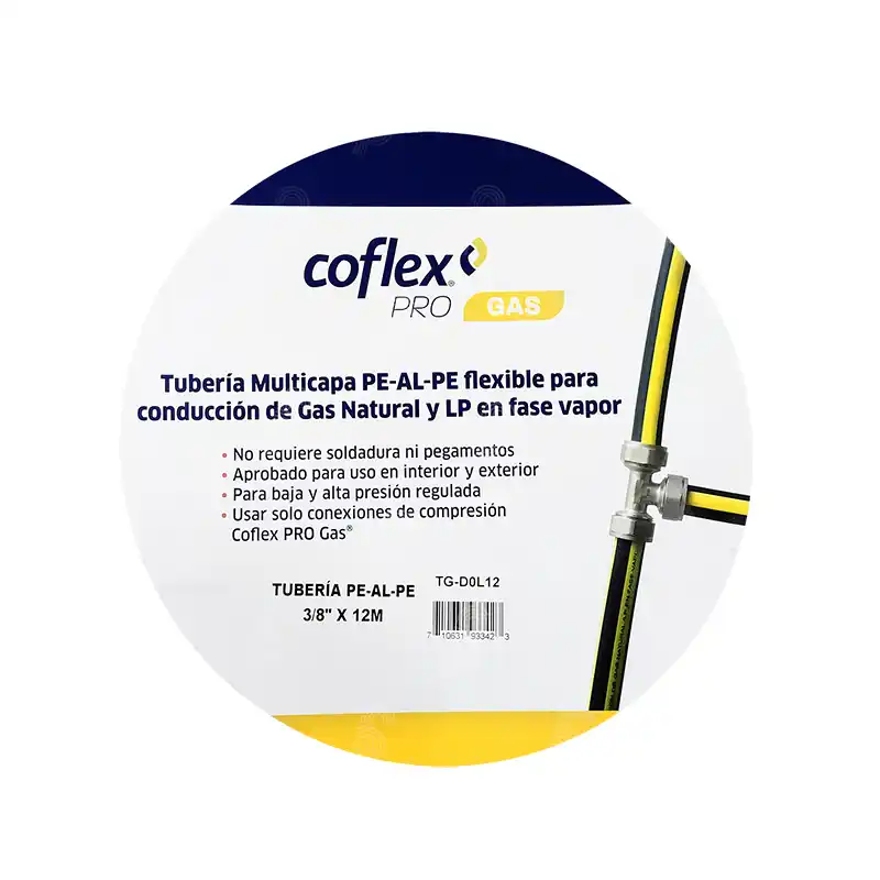 El Tubo PE-AL-PE Coflex PRO Gas TG-D0L12 es una tubería multicapa diseñada para instalaciones de gas natural y gas LP en fase vapor, tanto en alta como en baja presión regulada.
