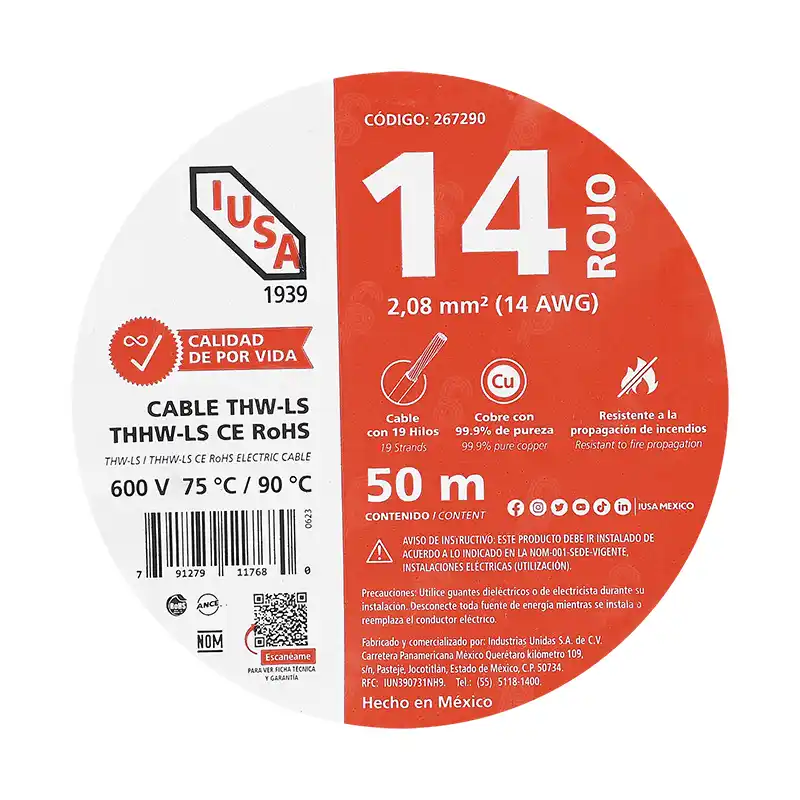 El cable THHW-LS ROHS Iusa 267290 Rojo Cal. 14 AWG es un conductor eléctrico de cobre con aislamiento termoplástico que resiste altas temperaturas y cuenta con características de seguridad importantes. Se utiliza principalmente para instalaciones eléctricas residenciales, comerciales e industriales.
