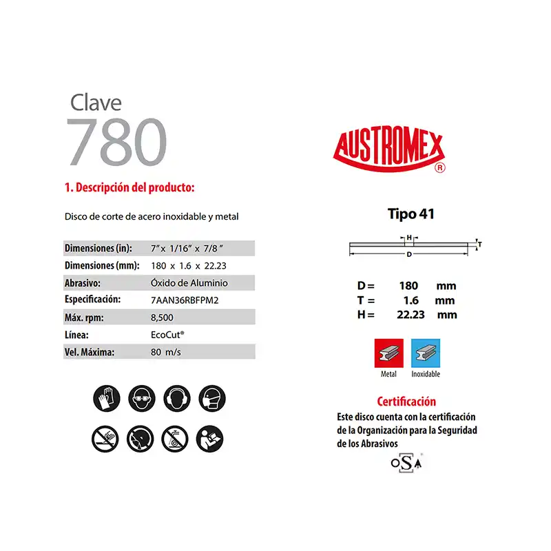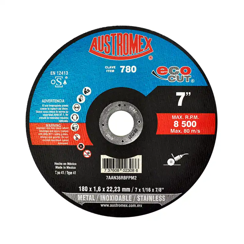 El Disco de Corte Metal Austromex 780, de la línea EcoCut, es un disco abrasivo diseñado para el corte de metal y acero inoxidable. Su tamaño de 7 pulgadas lo hace compatible con esmeriladoras angulares, y su diseño permite un corte eficiente.