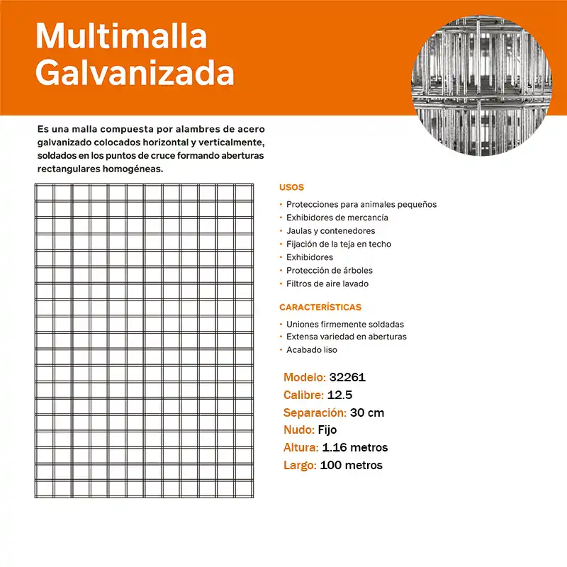 Malla formada por alambres galvanizados horizontales y verticales unidos por un nudo independiente que le da mayor resistencia al impacto, además de mayor durabilidad en diferentes climas por el recubrimiento clase I. Ideal para delimitar perímetros de áreas urbanas, agroindustriales, huertos, invernaderos y áreas rurales.