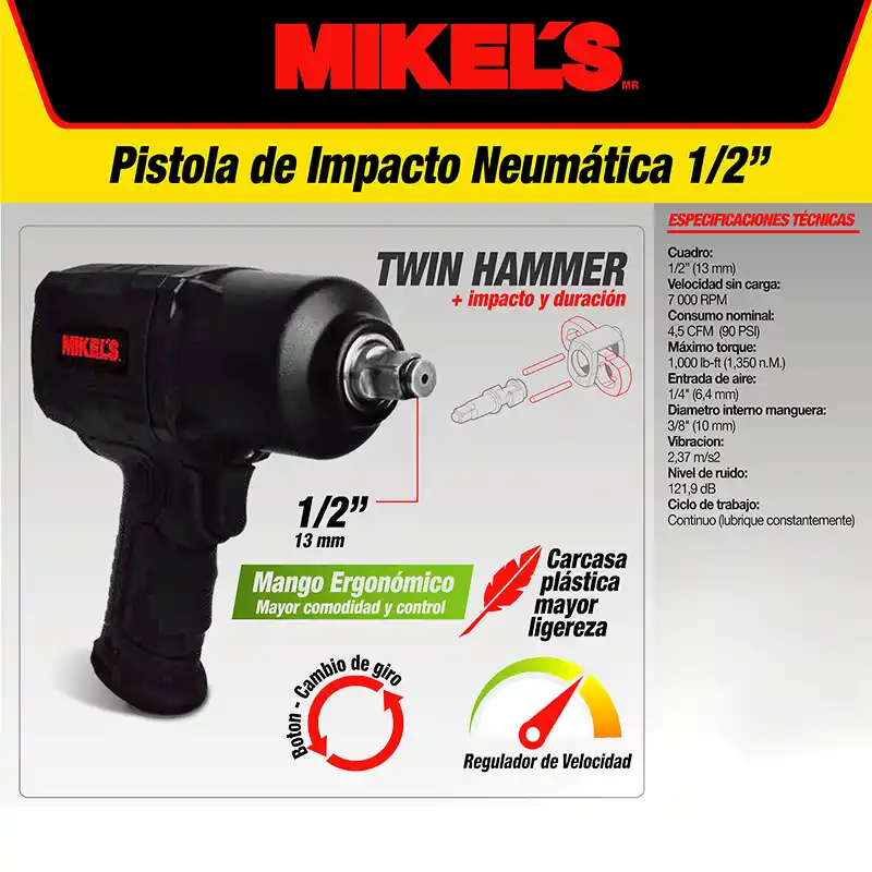 Pistola de Impacto Neumática Mikel's PIN-1350 de 1/2 pulgada ideal para aplicaciones automotrices y mecánicas exigentes. Puede ser utilizada para ajustar y aflojar tuercas estándar M12 - M20 (1/2 - 3/4 pulg) y de alta tenacidad M12 - M16 (1/2 - 5/8 pulg).