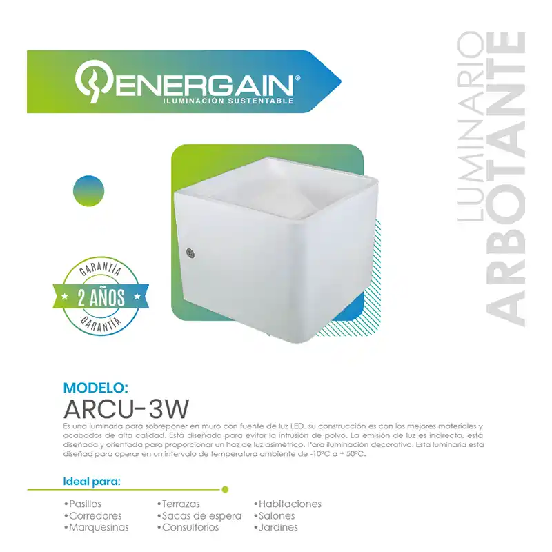 El arbotante LED asimétrico Energain EG-ARCU-3W en blanco cálido es una luminaria decorativa y funcional, ideal para resaltar muros exteriores con un toque moderno y discreto.