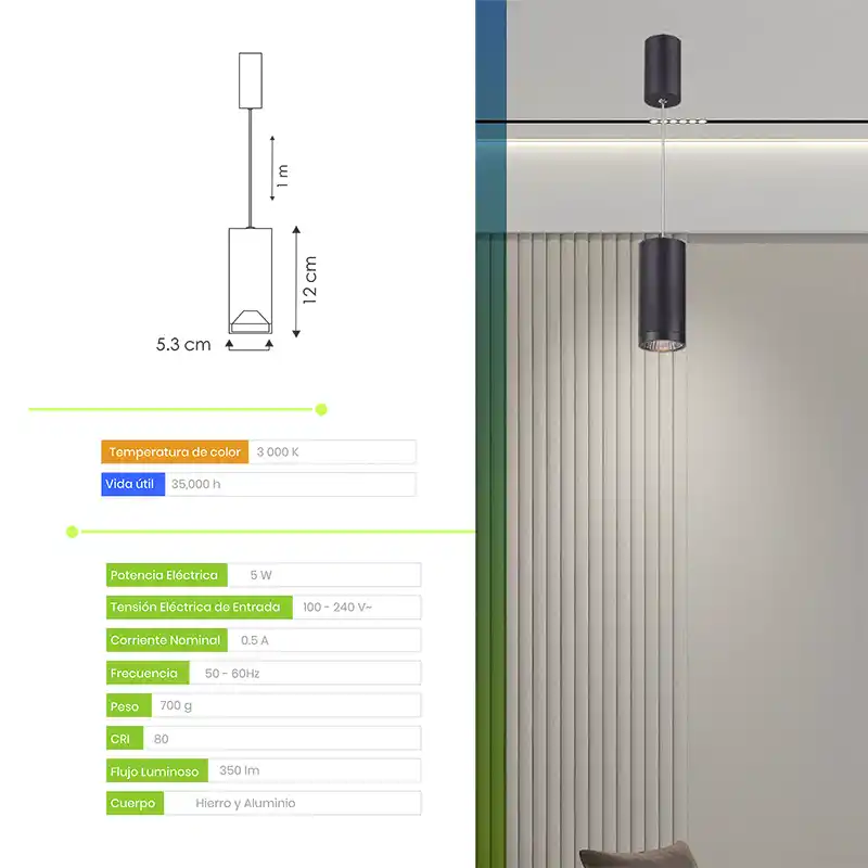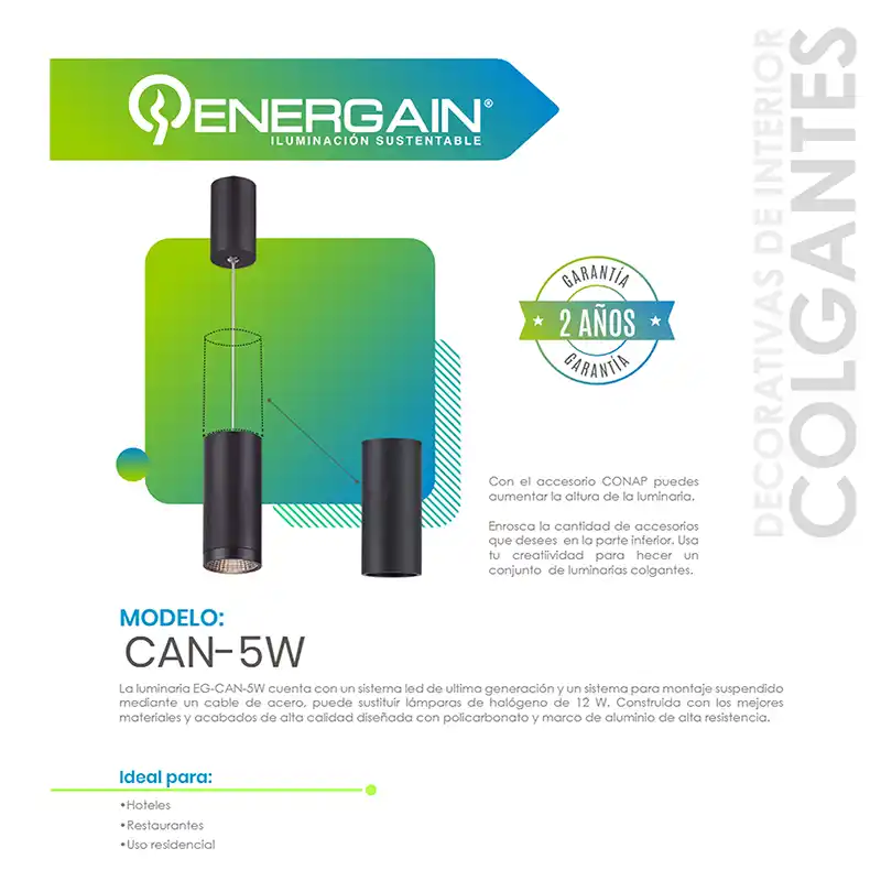 La lámpara colgante LED Energain EG-CAN-5W combina diseño moderno con eficiencia lumínica, ideal para interiores que buscan estilo y funcionalidad.
