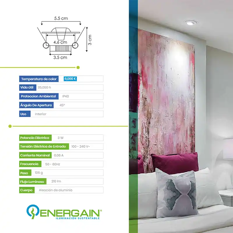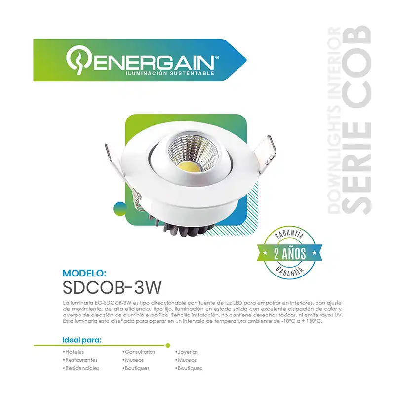 La Lámpara LED Empotrable Energain EG-SDCOB-3W Blanco Cálido es una excelente opción para iluminación de acento en interiores.