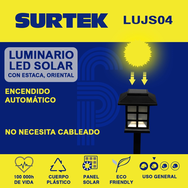 Lámpara Tipo Estaca LED Solar Surtek LUJS04 estilo Oriental es ideal para jardín, senderos o áreas verdes.