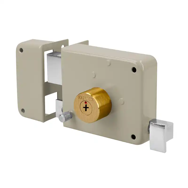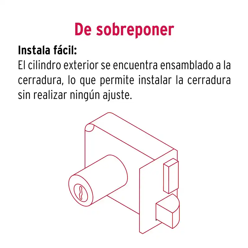 La cerradura de sobreponer Hermex 43586 (CS-85IB) es un modelo de instalación sencilla para puertas de madera o metálicas con un espesor de hasta 38 mm. Funciona con llave de tipo tetra y está diseñada para puertas con apertura hacia la izquierda.