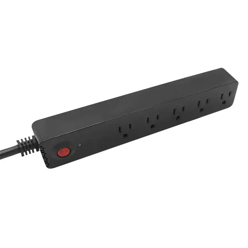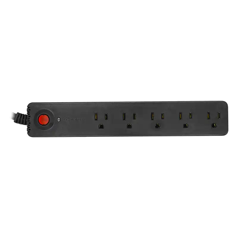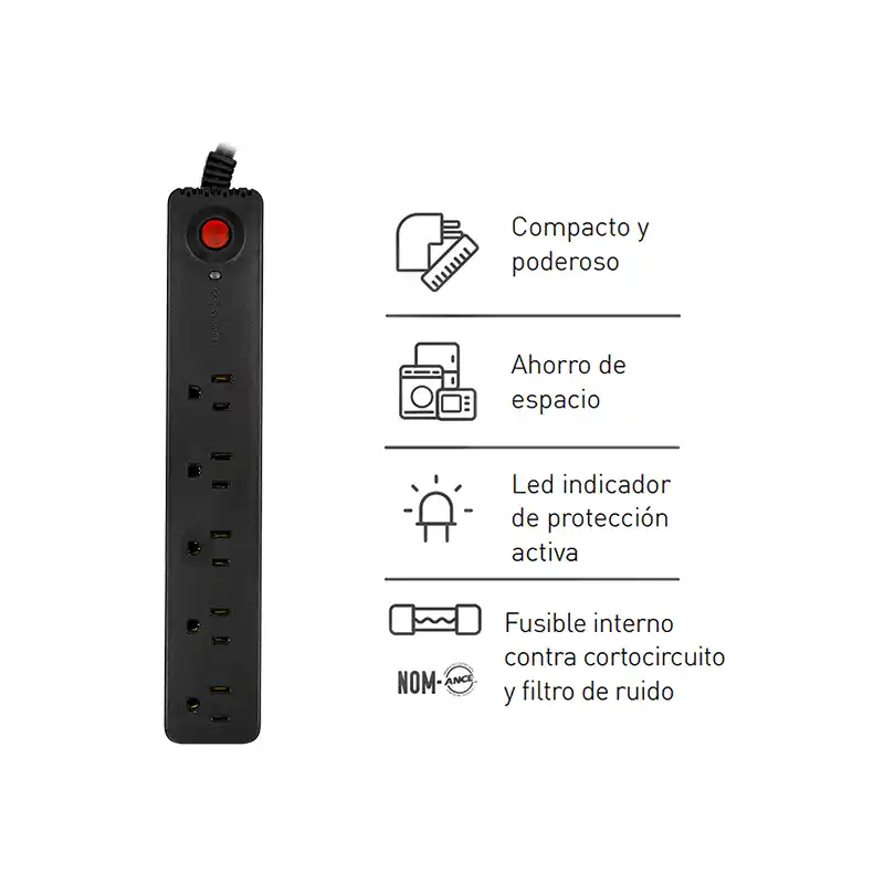 Barra multicontacto con supresor de picos diseñada para proteger hasta cinco dispositivos simultáneamente.