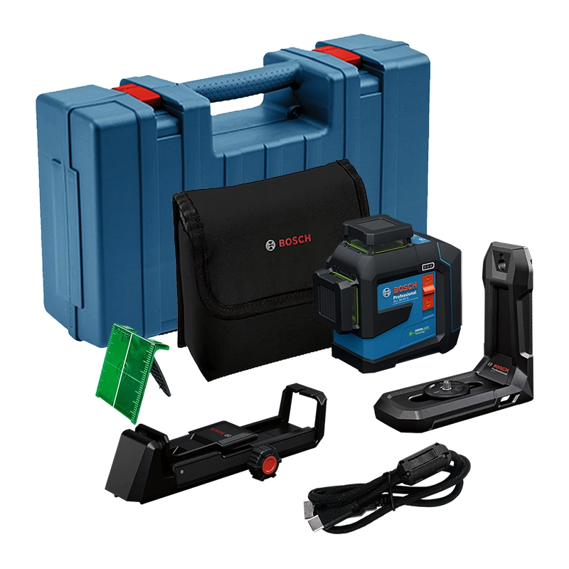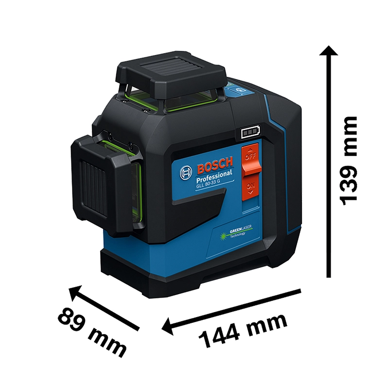 El Nivel láser de líneas Bosch GLL 80-33 G Professional es una herramienta ideal para una amplia gama de proyectos profesionales. Proyecta tres líneas láser verdes de 360 grados, lo que permite nivelar completamente una sala sin necesidad de reposicionar el dispositivo.