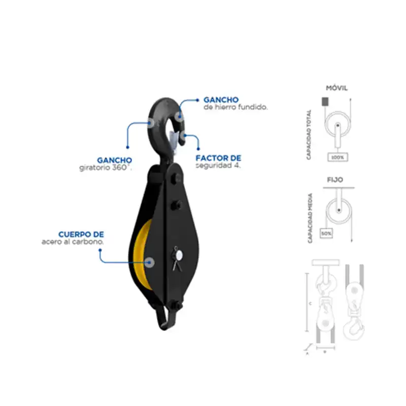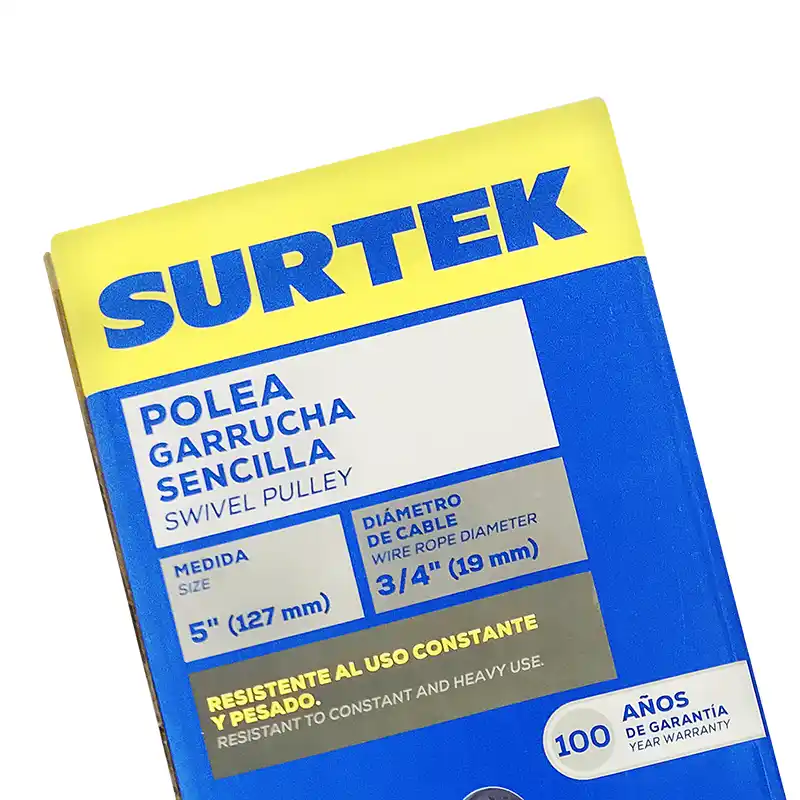 La Polea Garrucha Sencilla Surtek PGS15 Giratoria tiene una capacidad de carga de 1.5 toneladas (1,500 kg), y un diámetro de 5 pulgadas. Está diseñada para facilitar la elevación de objetos mediante cable de acero.