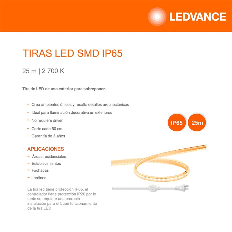 La tira LED Luz Cálida Ledvance 93135 para exterior es un producto de iluminación de 25 metros de longitud con una potencia de 6.5W por metro. Está diseñada para uso exterior gracias a su clasificación de protección IP65, que la hace resistente al agua y al polvo.