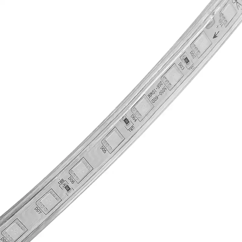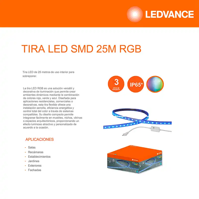 La tira LED RGB Ledvance 93141 es un modelo para exterior con una longitud de 25 metros, tecnología SMD y protección IP65. A diferencia de las tiras de bajo voltaje, esta se conecta directamente a una toma de corriente de 120V y ofrece varios colores, lo que la hace ideal para acentuar espacios exteriores.