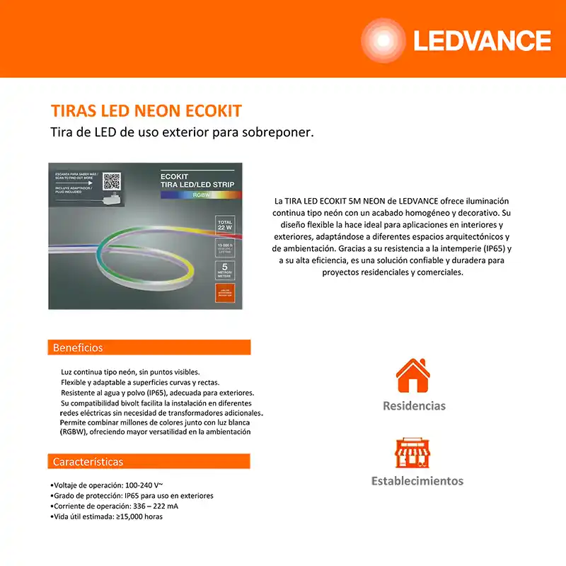 La Tira LED Neón de 5 metros LEDVANCE es una solución de iluminación flexible y decorativa que emula el efecto visual del neón tradicional, con la eficiencia y durabilidad de la tecnología LED. Su cubierta difusora de silicón permite una emisión de luz continua y uniforme, sin puntos visibles, ideal para lograr acabados estéticos y modernos.
